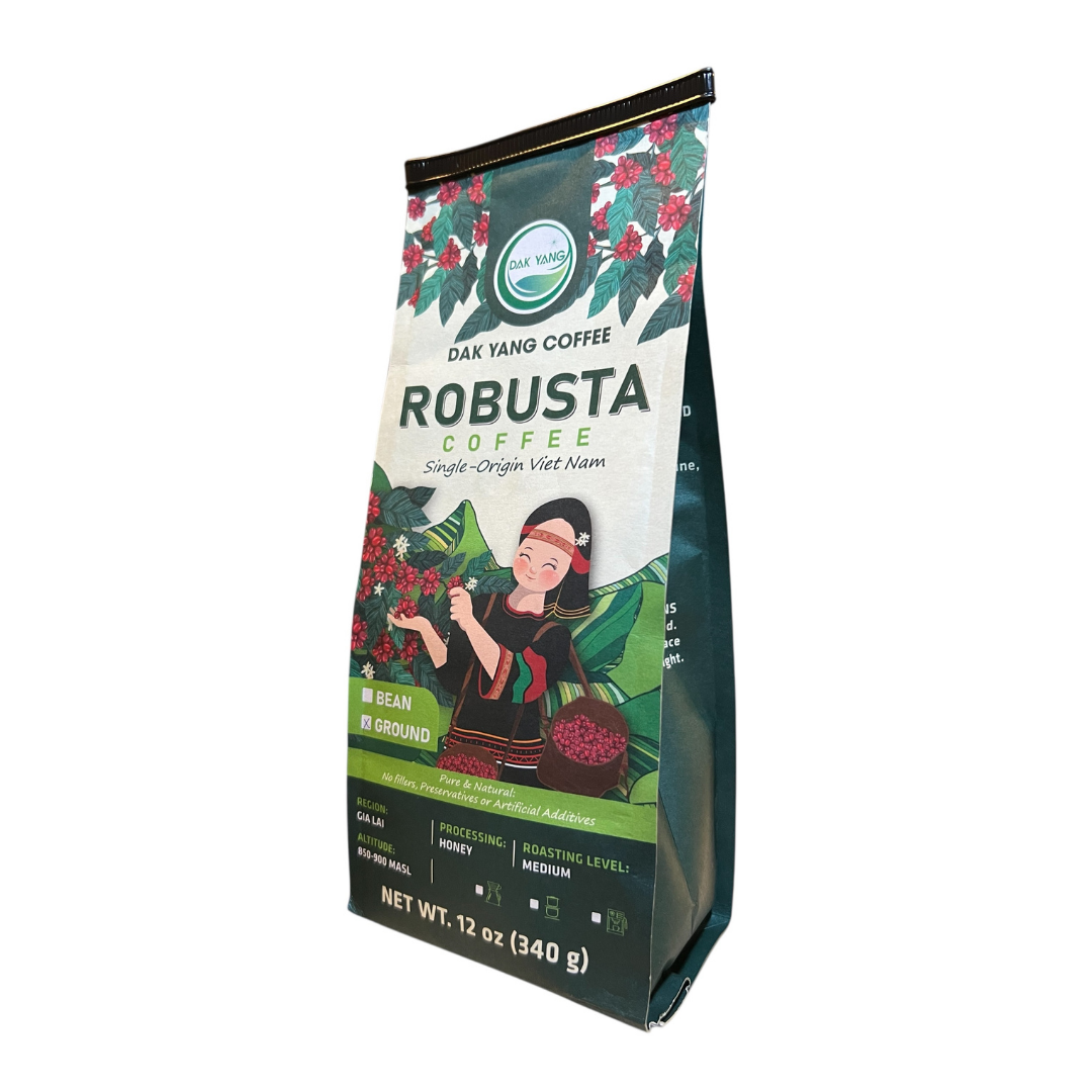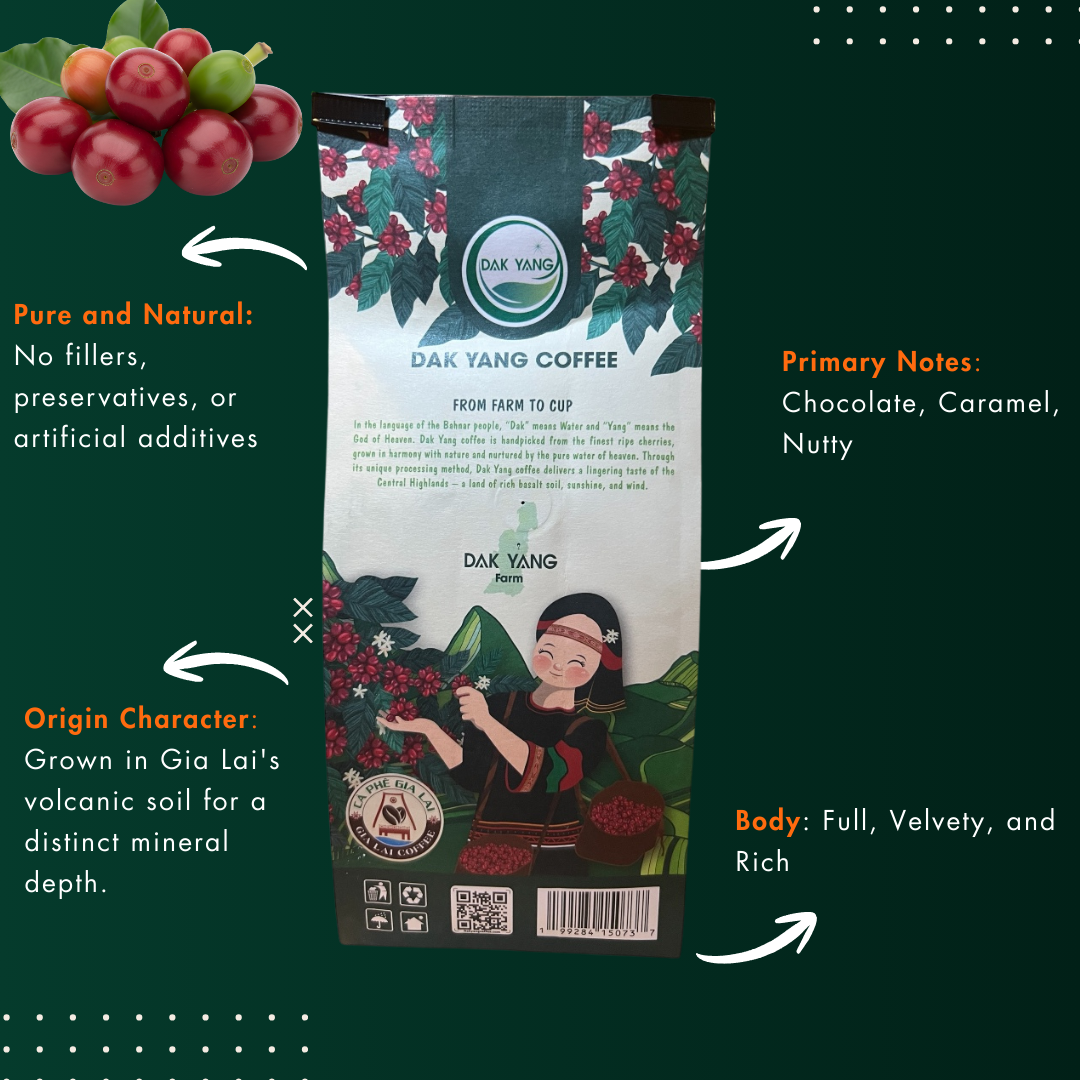 Discover the deep, soul-satisfying richness of authentic Vietnamese coffee. Our Dak Yang Specialty Ground Coffee is a premium single-origin offering from the fertile red basalt soil of the Gia Lai highlands. Every bean is meticulously hand-harvested in two stages to ensure only the cherries at peak ripeness make it into your cup. This dedication to quality results in a bold, full-bodied coffee that is naturally low in acidity and high in energy.